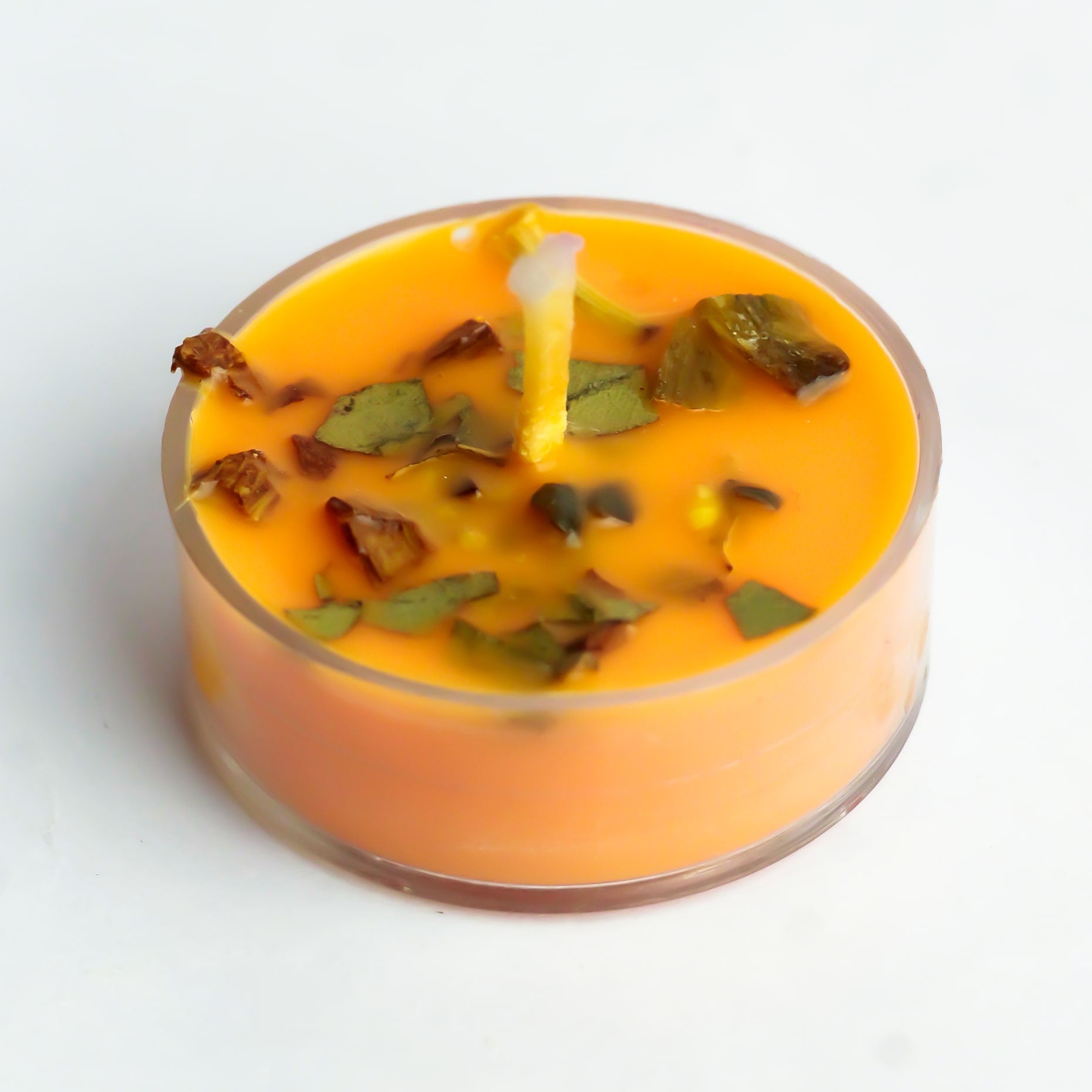 Orange tea light 100% soy candle - For abundance, combine orange blend chips with tiger's eye stones. Enhance this blend with a herbal mix of morning glory seeds (ground into a fine powder), cinnamon powder, and bay leaves powder. This potent combination amplifies intentions for abundance, manifesting prosperity and positive energy. The orange blend chips and tiger's eye stones work together to attract abundance, while the herbal mix adds an extra layer of manifestation power. Use this blend to create a sacred space for abundance and watch your intentions come to life.